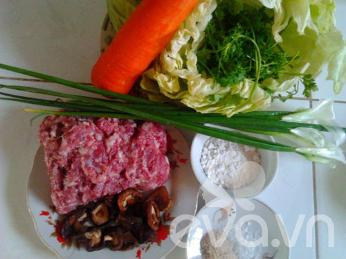 - Nấm hương rửa sạch, ngâm mền rồi cắt nhỏ, băm nhỏ một nửa củ cà rốt; hành tẽ nhỏ thành từng cọng; rửa sạch rau bắp cải và rau mùi.